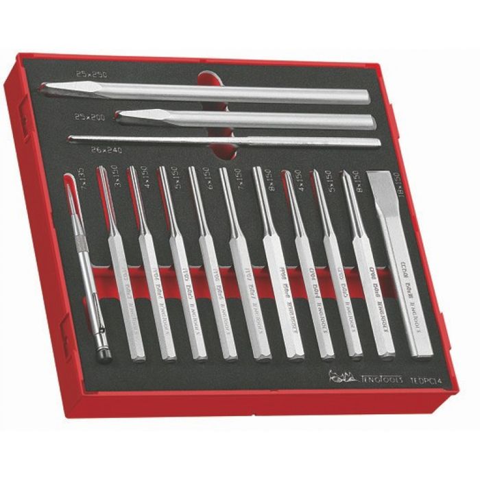 14 piece set including parallel pin punches, centre punch and cold chisels. The set is supplied in a unique Teng Tools TC tray and can be used either on it's own or as part of the Teng Tools TC control system. The tray features a removable hinged click lock lid and dove tail joints which enable different TC trays to be locked together and used as trays in Teng Tools tool boxes and roller cabinets. The tools are held in place using the Teng Tools two colour pre-cut EVA foam which has been computer milled to house each specific tool. The top layer of the foam is black and the bottom layer is red so that as soon as a tool is taken out, the shape of the tool is clearly visible. The EVA foam is also etched with the size or description of the tool next to it's position so that if a tool is missing not only can the space be clearly seen but the missing tool can be identified quickly. (265x284x50mm).