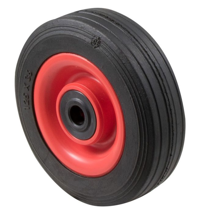 General purpose utility wheel, 125mm x 38mm black rubber tyre, plastic center, plain bearing, 1/2 inch ID (inside diameter), bore, 50 kg load