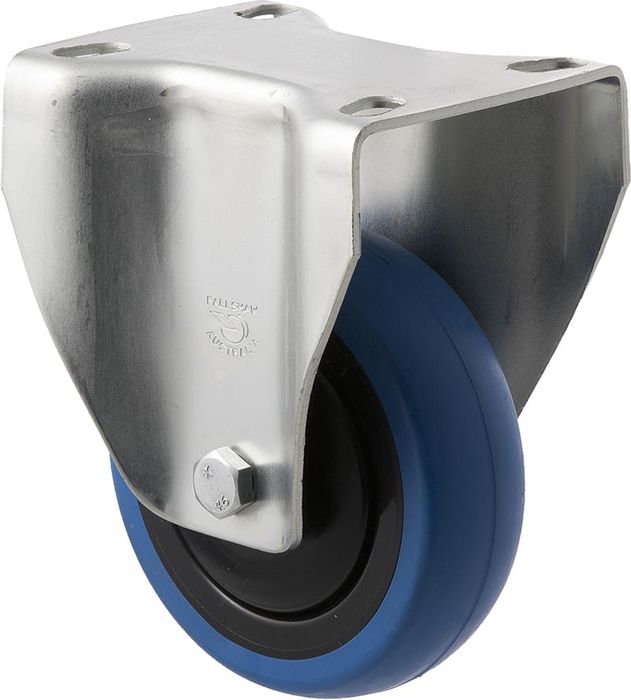M Series castor, 100mm blue rubber wheel, thread guard, fixed plate fork, precision ball bearing, 100 kg load rating