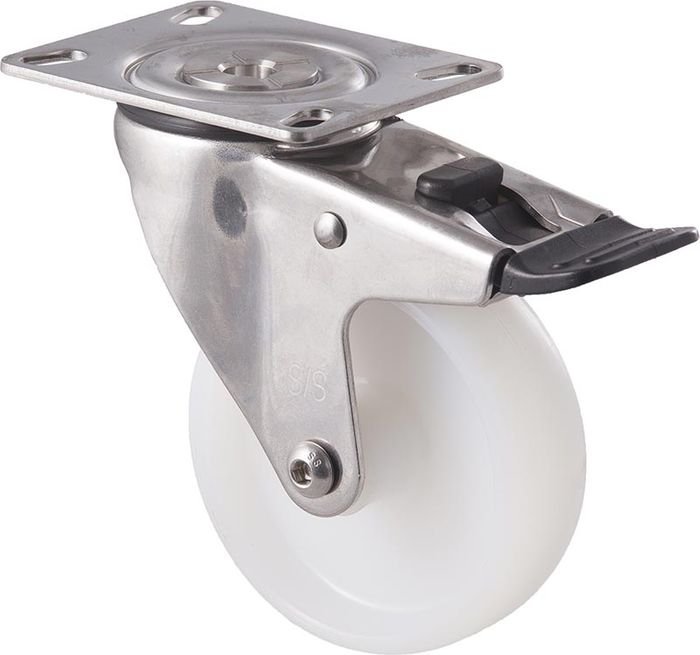 M Series castor, 100mm white nylon wheel, plain bearing, stainless steel swivel plate, total brake, axle spacer, 150 kg load