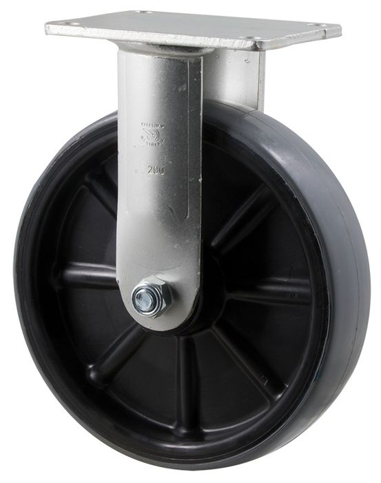 H Series castor, 200mm x 48mm polyurethane (PU) on nylon wheel, roller bearing, fixed plate, zinc fork, 500 kg load rating.