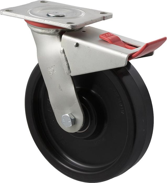 H Series castor, 200mm black nylon wheel, swivel plate braking castor, 600 kg load rating.