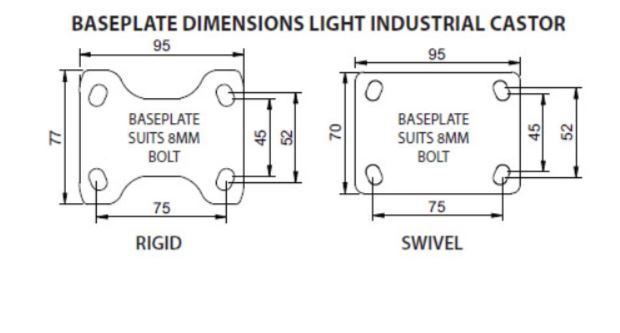 The S5586 manufactured by Richmond Wheel and Castor Co. is a swivel frame castor and uses a polyurethane wheel. This swivel castor is part of our chrome durolite plate range and can safely take loads up to 100kg. The S5586 uses ball bearings for wheel rotation and is mounted with the baseplate. The swivel frame permits the load to be steered. The diameter of the polyurethane wheel is 125mm, the wheel width is 32mm and you can order separately (Part Number: PU5555).