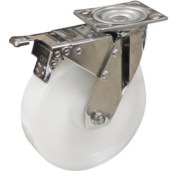 The 200mm Nylon Wheel Richmond Castor – S8380SLB is part of our extensive range of heavy industrial castors. The wheel features Stainless Steel Roller Bearings and the wheel diameter is 200mm (8″). The Nylon wheel can viewed here. The maximum load capacity of this heavy duty industrial castor is 300kg.