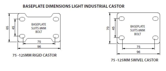 Available with a large range of wheels each designed to suit varied floor surfaces, application and load requirements – Richmond’s Light Industrial Series castors are ideal for use on mobile equipment, hospital equipment, nurseries, shops and general industry. The light industrial series is the castor of choice or green grocers and market stalls for produce bins as it provides an economical hard wearing reliable castor. Combining a zinc plated corrosion resistant frame and a robust twin race swivel ensures a long and productive life.