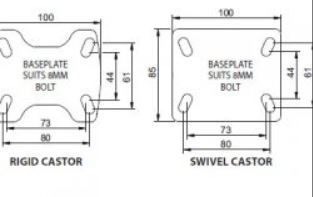 The S4044B from Richmond is a swivel frame castor and uses a polyurethane wheel. This swivel castor is in our 300 series plate range and can safely take loads up to 200kg. The S4044B is assembled with roller bearings on the castors axle and is baseplate mount. The swivel frame design of this castor permits the load to be steered. The outside diameter of the polyurethane wheel is 100mm, the wheel width is 35mm and can be ordered separately (PU4408). To order this castor without a brake, search for S4044.