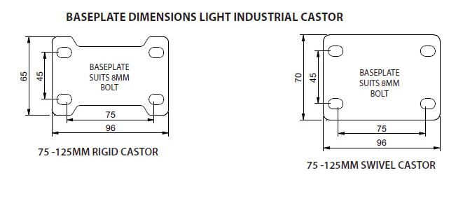Available with a large range of wheels each designed to suit varied floor surfaces, application and load requirements – Richmond’s Light Industrial Series castors are ideal for use on mobile equipment, hospital equipment, nurseries, shops and general industry. The light industrial series is the castor of choice or green grocers and market stalls for produce bins as it provides an economical hard wearing reliable castor. Combining a zinc plated corrosion resistant frame and a robust twin race swivel ensures a long and productive life.
