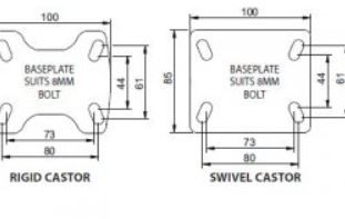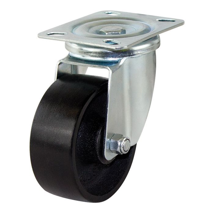 The S4050 manufactured by Richmond Wheel and Castor Co. is a swivel frame castor and uses a cast iron wheel. This swivel castor is in our 300 series plate range and has a top load capacity of 200kg. The S4050 uses plain bearings for wheel rotation and is baseplate mount. This castors swivel frame allows for full 360° swivel rotation. The diameter of the cast iron wheel is 100mm, the wheel width is 38mm and you can order separately (Part Number: Ci421).