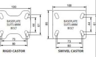 The S4060 manufactured by Richmond Wheel and Castor Co. is a swivel frame castor and uses a glass filled nylon wheel. This swivel castor is one of our 300 series plate range and can hold loads up to 200kg. The S4060 is assembled with plain bearings on the castors axle and is baseplate mount. This castors swivel frame permits the load to be steered. The overall glass filled nylon wheel diameter is 100mm, the wheel width is 35mm and can be ordered separately (GF412).