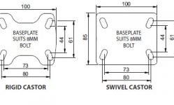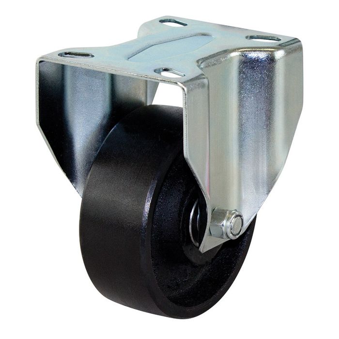 The R4053 from Richmond Wheel and Castor Co. is a rigid frame castor and has a cast iron wheel. This rigid castor is in our 300 series plate range and has a top load capacity of 200kg. The R4053 is assembled with ball bearings on the castors axle and is baseplate mount. The rigid frame design of this castor only allows linear movement unless used with swivel castors. The outside diameter of the cast iron wheel is 100mm, the wheel width is 38mm and can be ordered separately (Ci400).