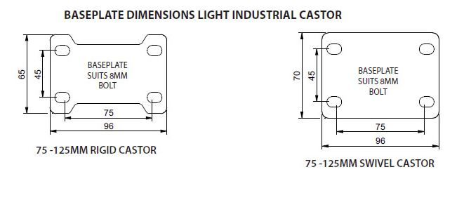 Available with a large range of wheels each designed to suit varied floor surfaces, application and load requirements – Richmond’s Light Industrial Series castors are ideal for use on mobile equipment, hospital equipment, nurseries, shops and general industry. The light industrial series is the castor of choice or green grocers and market stalls for produce bins as it provides an economical hard wearing reliable castor. Combining a zinc plated corrosion resistant frame and a robust twin race swivel ensures a long and productive life.