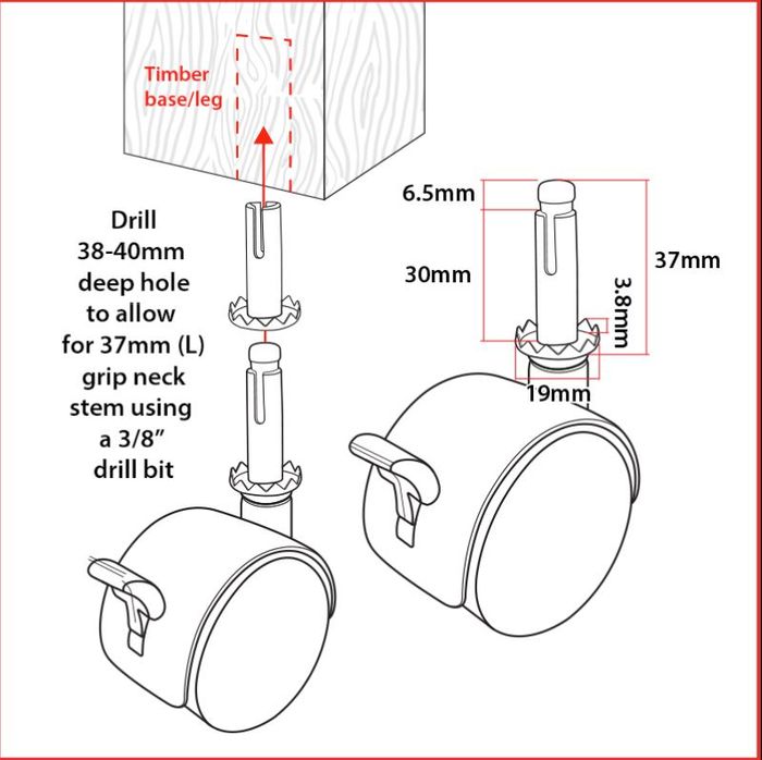 To fit this castor a 38-40mm deep hole will need to be drilled in the timber surface using a 3/8″ drill bit to allow for the 37mm long Grip Neck stem to be inserted.