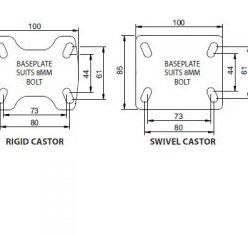 The R4033 by Richmond Wheel and Castor Co. is a rigid frame castor and uses a nylon wheel. This rigid castor is in our 300 series plate range and can safely take loads up to 200kg. The R4033 is assembled with plain bearings on the castors axle and is baseplate mount. The rigid frame design of this castor is ideal for linear movement however steering can be achieved by using with swivel castors. The outside diameter of the nylon wheel is 100mm, the wheel width is 35mm and can be ordered separately (NY401).
