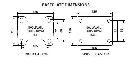 The S6054 from Richmond is a swivel frame castor and is fitted with a rebound polyurethane wheel. This swivel castor is part of our 300 series plate range and has a maximum capacity of 300kg. The S6054 is assembled with stainless steel roller bearings on the castors axle and is mounted with the baseplate. The swivel frame of this castor allows for full 360° swivel rotation. The outside diameter of the rebound polyurethane wheel is 150mm, the wheel width is 40mm and you can order separately (Part Number: RP6072). For the same castor with a brake, see S6054B.