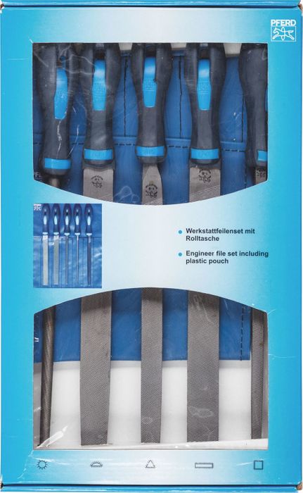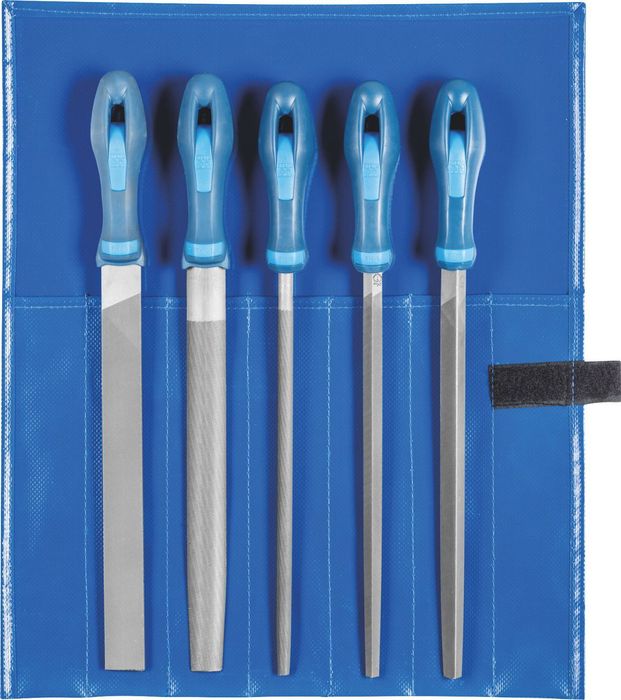 Quality files for industry and craftswork in protective and climate-resistant PVC roll pouch for storage in a toolbox or on a toolbench. Each file includes includes an ergonomic file handle.