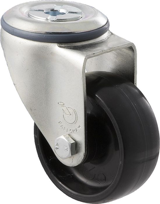 M Series castor, 75mm black nylon wheel, plain bearing, swivel bolt hole, 150 kg load