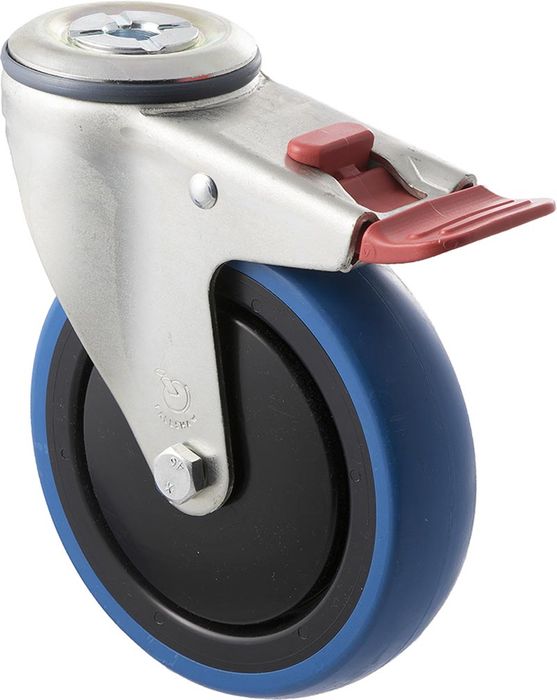 M Series castor, 125mm blue rubber wheel, thread guard, swivel bolt hole & total brake, 100 kg load rating