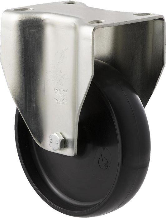 M Series castor, 125mm black nylon wheel, plain bearing, zinc fork, fixed plate, 150 kg load