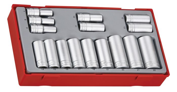 Set containing 16 deep 3/8" drive 6 point sockets. The set is supplied in a unique Teng Tools TC tray and can be used either on it's own or as part of the Teng Tools TC control system. The tray features a removable hinged click lock lid and dove tail joints which enable different TC trays to be locked together and used as trays in Teng Tools tool boxes and roller cabinets. All of the tools in the set have their own individual place so lost tools can easily be identified. (265x142x50mm, 1.5 kilos).