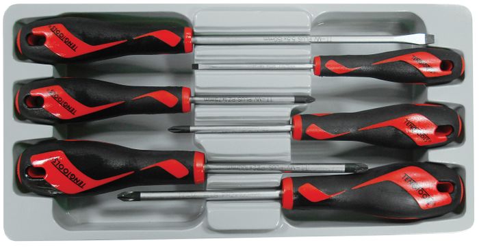 A set of 6 screwdrivers for slotted, Phillips and Pozi drive heads. The screwdrivers feature TT-MV PLUS steel blades and ergonomically designed bi-material handles with hanging hole and T drive facility for added torque and comfort. The screwdrivers are supplied in a full colour display box with PS tray.