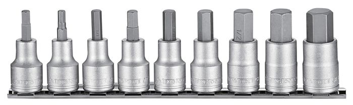 Set of 9 1/2" drive AF hex bit sockets for internal hex holes with a satin finish supplied on a clip rail.