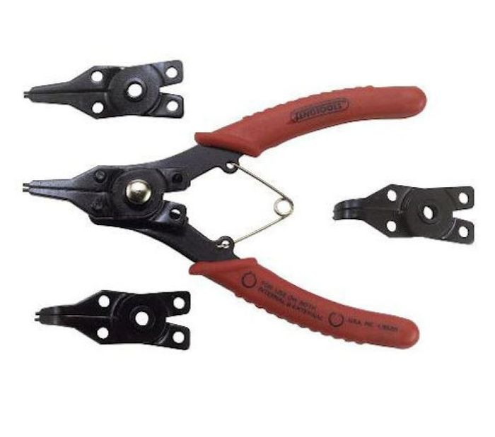 For internal and external circlips 10-50mm. Four interchangeable heads giving eight different combinations. The tips are magnetic. Return spring. Plastic covered handles.
