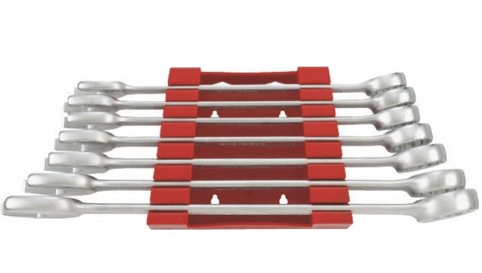 7 piece metric combination spanner set with the same dimensions at both ends. The 12 point ring head is set at a 15° angle. The spanners feature polished heads with a satin finish and are supplied in a special holder so that it can be connected with the 6515MMA and 6507JMMA spanner sets.