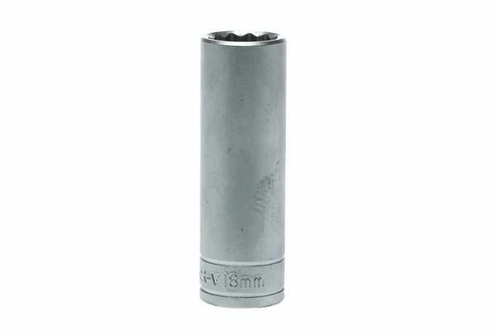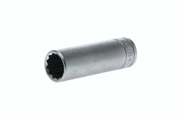 1/2" drive 12 point deep metric socket made from chrome vanadium with a satin finish. DIN 3120/3124/ISO 2727