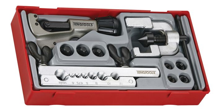 A comprehensive tube flaring kit which is suitable for copper, brass and thin walled aluminium tubing. 45ß tube press flare pipes from 3/16” to 5/8” diameter. The pipe cutter can cut up to 30mm diameter. Features include a spare cutting wheel inside the handle. The set is supplied in a unique Teng Tools TC tray and can be used either on it's own or as part of the Teng Tools TC control system. The tray features a removable hinged click lock lid and dove tail joints which enable different TC trays to be locked together and used as trays in Teng Tools tool boxes and roller cabinets. All of the tools in the set have their own individual place so lost tools can easily be identified. (265x142x50mm, 1.7 kilos).