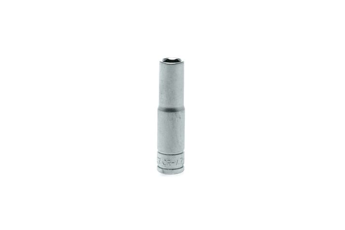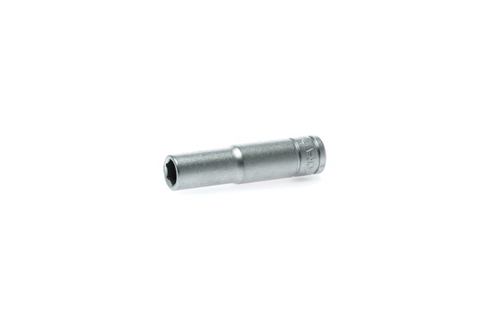 1/4" drive 6 point deep metric socket made from chrome vanadium with a satin finish. DIN 3120/3124/ISO 2729