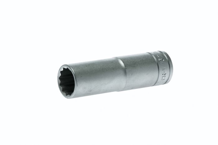 1/2" drive 12 point deep metric socket made from chrome vanadium with a satin finish. DIN 3120/3124/ISO 2727