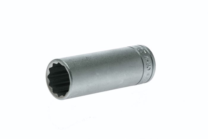 1/2" drive 12 point deep metric socket made from chrome vanadium with a satin finish. DIN 3120/3124/ISO 2727