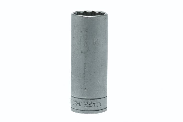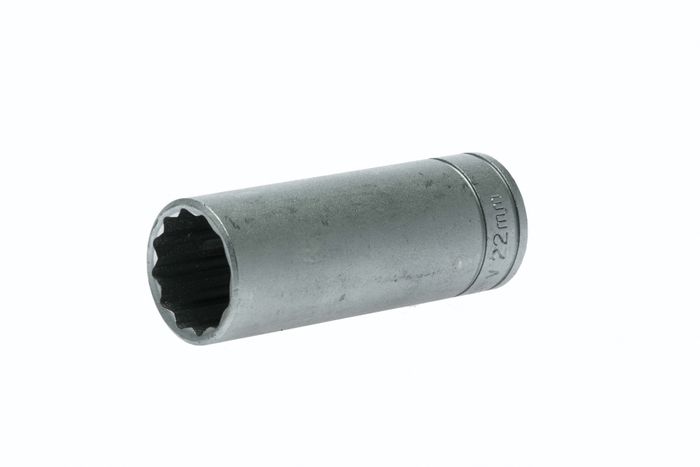 1/2" drive 12 point deep metric socket made from chrome vanadium with a satin finish. DIN 3120/3124/ISO 2727