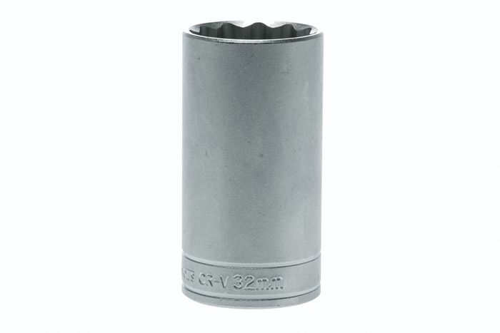 1/2" drive 12 point deep metric socket made from chrome vanadium with a satin finish. DIN 3120/3124/ISO 2729