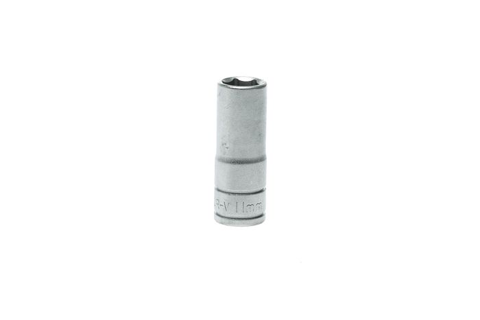 3/8" drive 6 point deep metric socket made from chrome vanadium with a satin finish. DIN 3120/3124/ISO 2729