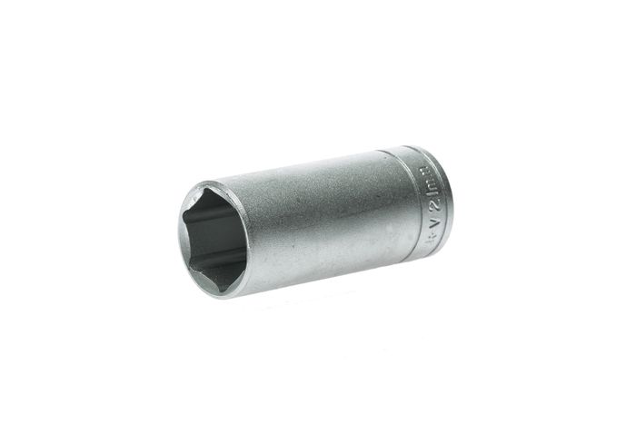 3/8" drive 6 point deep metric socket made from chrome vanadium with a satin finish. DIN 3120/3124/ISO 2739
