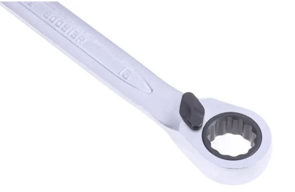 This Teng Tools ratcheting combination spanner combines an open ended spanner with a 72-tooth 12-point ring ratchet. The ratchet has a flip reverse feature, which switches the direction of the ratchet, and it is offset at a 13 angle for ease of access.
