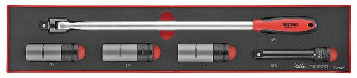 5 piece wheel removal tool set. The set is supplied in a unique Teng Tools drawer width TTX tray and can be used either on it's own or as part of the Teng Tools TC control system. The tray features a removable hinged click lock lid and dove tail joints which enable different TC trays to be locked together and used as trays in Teng Tools tool boxes and roller cabinets. The tools are held in place using the Teng Tools two colour pre-cut EVA foam which has been computer milled to house each specific tool. The top layer of the foam is black and the bottom layer is red so that as soon as a tool is taken out, the shape of the tool is clearly visible. The EVA foam is also etched with the size or description of the tool next to it's position so that if a tool is missing not only can the space be clearly seen but the missing tool can be identified quickly. (560x110x40mm).