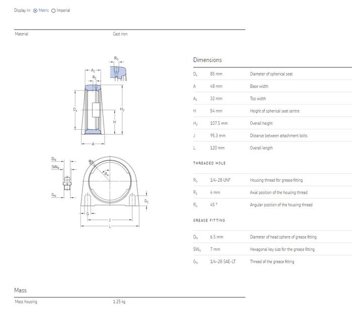 Spherical seating diameter85 mm