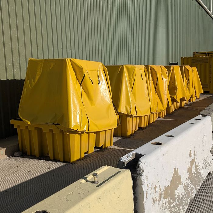 Stratex frameless covers for bunded spill pallets provide low-profile, weather-resistant protection that keeps your stored containers safe from rain, debris, and UV exposure—without getting in the way of access or visibility.