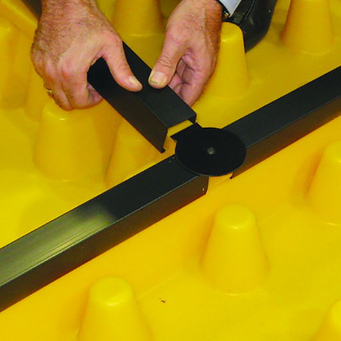 A flexible decking solution for creating liquid handling workstations and storage areas to fit your workplace. Low profile design gives easy access to drum tops and requires less effort to load and unload drums. All work floors and ramps have a slip resistant texture that provides traction to prevent slips and falls. Joint connector strips can be added for superior safety and finish. 2 different lengths of connectors and a cross connector are available.