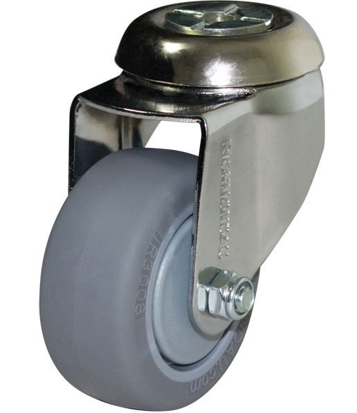The S3380 by Richmond Wheel and Castor Co. is a swivel frame castor and is fitted with a institutional rubber wheel. This swivel castor is in our chrome durolite bolt range and can safely take loads up to 80kg. The S3380 is assembled with ball bearings on the castors axle and is bolt mount. The swivel frame design of this castor allows full swivel rotation to enable steering. The outside diameter of the institutional rubber wheel is 75mm, the wheel width is 30mm and you can order separately (Part Number: iR3008).