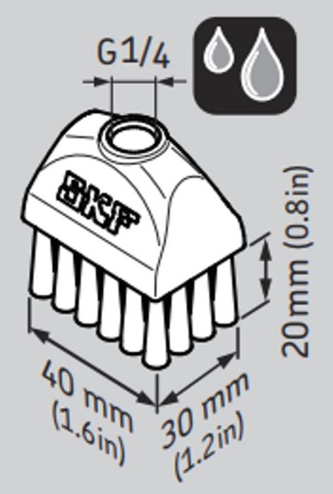The SKF LAPB 3X4E1 accessory is a brush size 30 x 40 mm with a G 1/4 female connection for oil lubrication suitable for LAGD, TLSD and TLMR single point automatic lubricators.