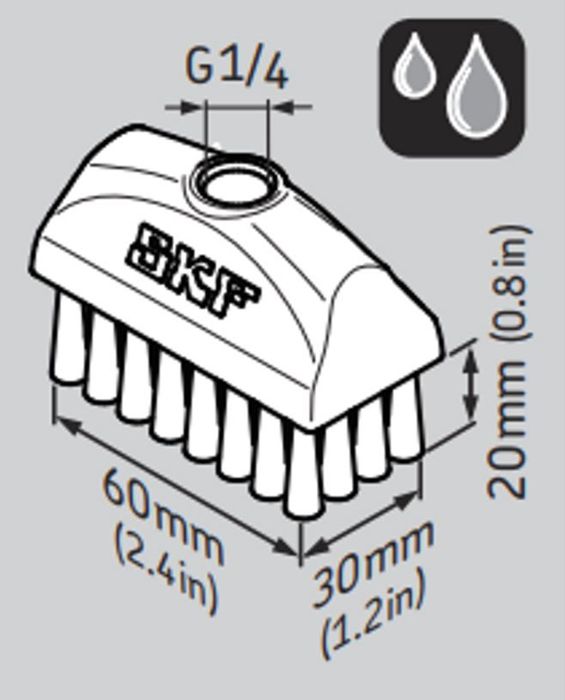 The SKF LAPB 3X7E1 accessory is a brush size 30 x 60 mm with a G 1/4 female connection for oil lubrication suitable for LAGD, TLSD and TLMR single point automatic lubricators.