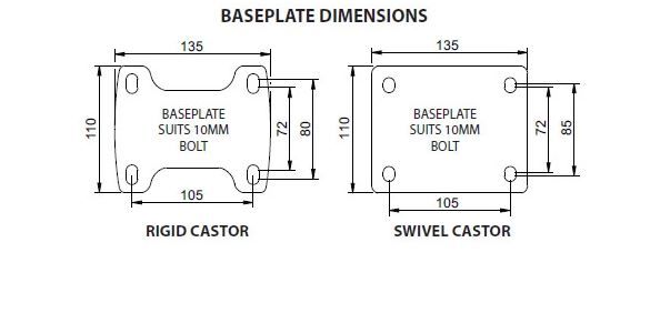The S8032B manufactured by Richmond Wheel and Castor Co. is a swivel frame castor and has a nylon wheel. This swivel castor is part of our 300 series plate range and can safely take loads up to 300kg. The S8032B uses plain bearings for wheel rotation and is mounted with the baseplate. The swivel frame allows the castor to swivel 360°. The overall nylon wheel diameter is 200mm, the wheel width is 50mm and can be ordered separately (NY800).