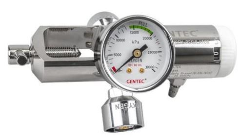 - Dual outlet click flow style regulator for medical oxygen, manufactured with a chrome plated brass body with a brass chamber