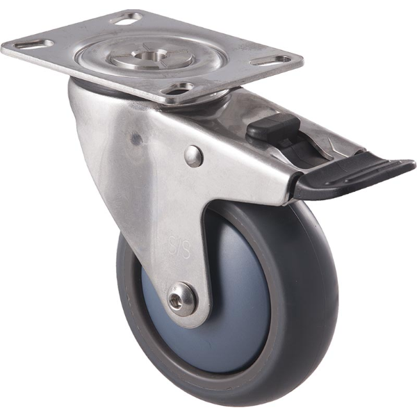 M Series castor, thermoplastic elastomer (TPE) 100mm wheel, stainless steel precision bearing, swivel plate & total brake, Bluestone thread guard, load rating 85 kg