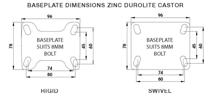 Available with a wide range of wheels, the Zinc Durolite Plate Series is commonly used on a vast array of mobile equipment. Enhanced by a twin swivel race ensuring longevity making it ideal for use in hospitals, retail shops and general industry. The baseplate of this castors has been designed for flexibility, with the bolt holes being slotted on an angle to allow users a multiple of mounting options. This means that the Zinc Durolite Plate castors can be matched with competitor and imported castors. The redesigned baseplate provides a superior castor for a growing number of uses and equipment.
