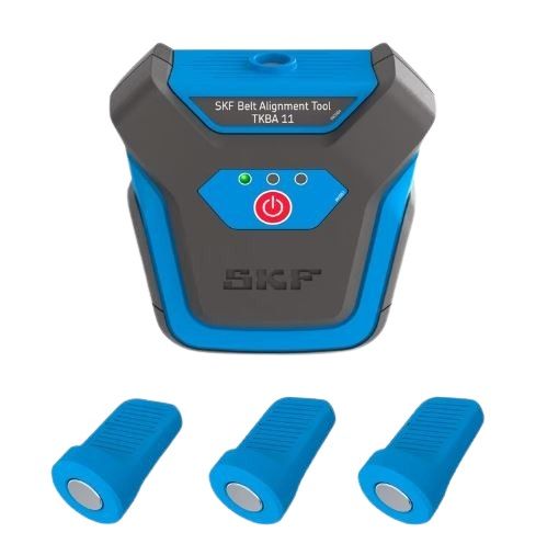 The belt alignment tool TKBA 11 has two components; a laser-emitting unit and three passive targets. Each is attached quickly and easily – using a powerful magnet – to the inside or outside face of a belt pulley or chain sprocket. The TKAB 11 alignment tool can be applied to most machines that use V belts, banded belts and ribbed belts – as well as those with chain sprockets.