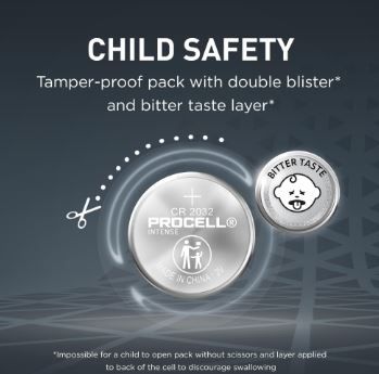 Procell Lithium Coin Intense 2032 industrial batteries are designed to deliver reliable and safe power in professional devices. To prevent accidental ingestion by children, Procell has developed tamper-proof packs with double blister so that it is impossible for a child to open without scissors and a bitter taste layer is applied on the back of the cell to discourage swallowing. Also available in 2025 and 2016 sizes.